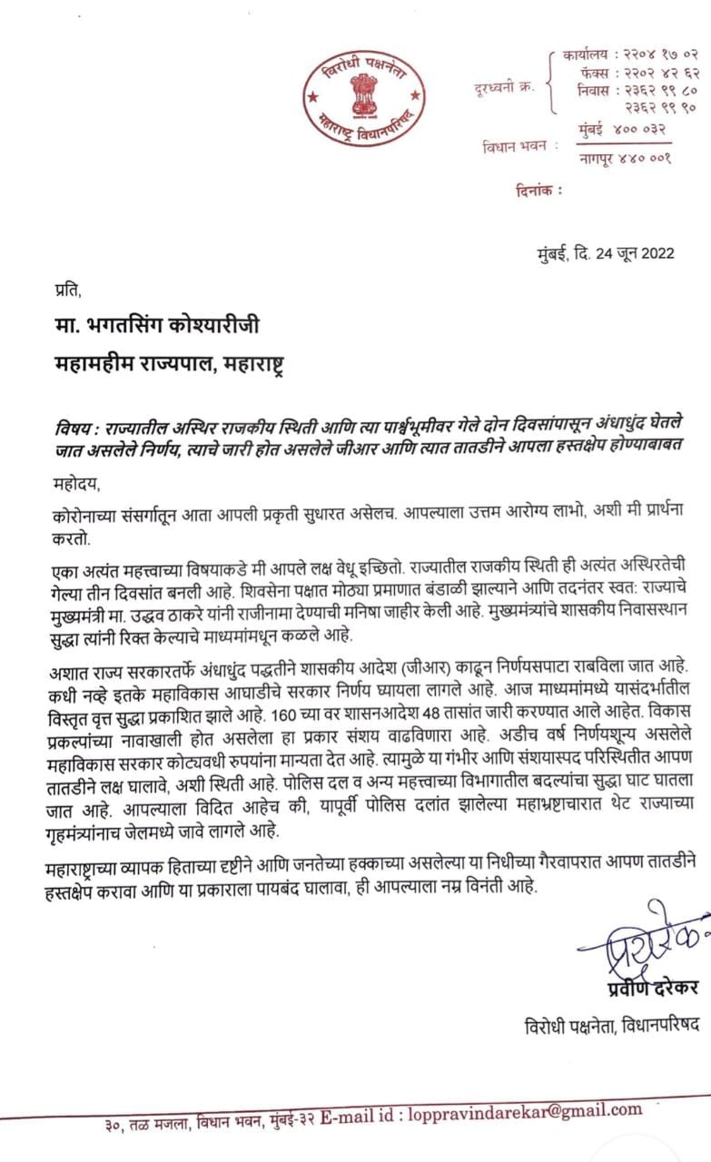 भाजपा ने महाराष्ट्र के राज्यपाल भगत सिंह कोश्यारी को पत्र लिखा है। पत्र में सियासी हलचल पर राज्यपाल से हस्तक्षेप और सरकार की ओर से लगातार लिए जा रहे फैसले पर हस्तक्षेप करने की मांग की गई है। पत्र में आगे कहा गया है- 160 से अधिक के सरकारी आदेश 48 घंटे के भीतर जारी किए गए हैं। विकास परियोजनाओं की आड़ में हो रही इस तरह की घटना संदेह पैदा कर रही है।